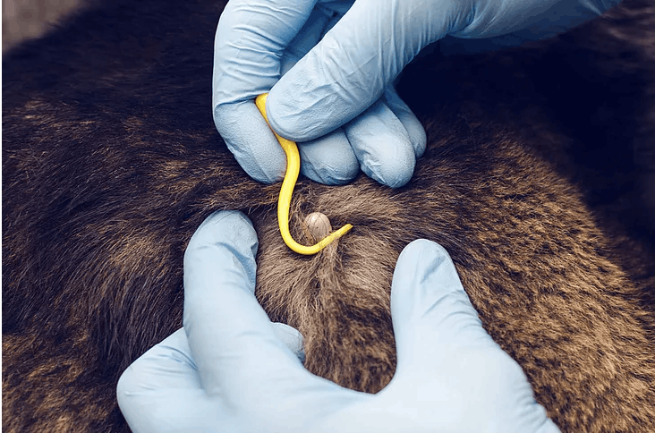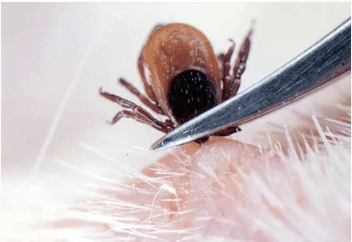 - Use the tweezers to grasp the head of the tick as close to your pet’s skin as possible. Be careful not to squeeze the tick’s belly in the process. This increases the risk of infection to your pet if the tick is carrying Lyme disease or other bacteria. Take a deep breath and then slowly but firmly remove the parasite by pulling perpendicularly to your pet’s skin. If using a tick removal tool, slide the end under the tick’s head as close as possible to the skin and twist until the tick releases.