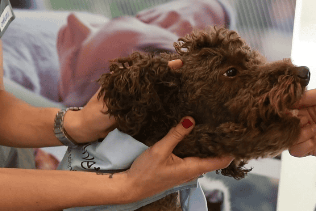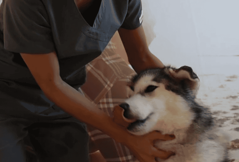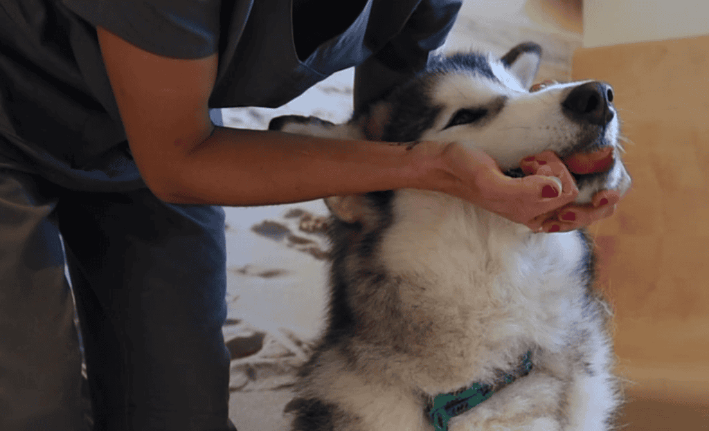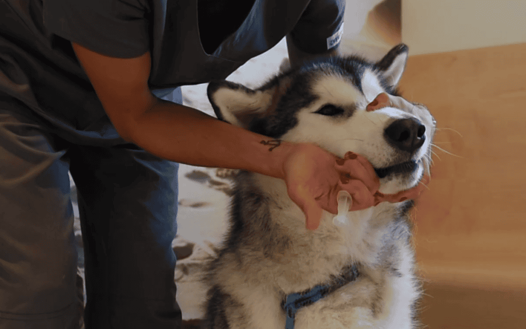 - Chien plus grand : faites-le asseoir pour qu’il ait le dos appuyé sur vos jambes. Vous pouvez également vous placer à côté de lui alors qu’il est en position assise, près d’un mur pour éviter qu’il ne recule.